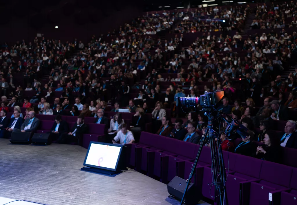 Vue en plongée d'un public nombreux et attentif assis dans un grand auditorium lors d'un événement organisé par l'agence gcom.